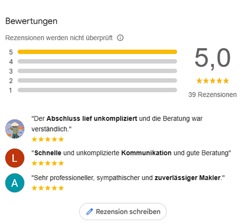 Über 40 Kunden haben uns auf Google mit 5,0 von 5 Sternen bewertet. Diese Rückmeldungen sind für uns ein klares Zeichen dafür, dass unsere Arbeit nicht nur fachlich überzeugt, sondern auch menschlich passt.